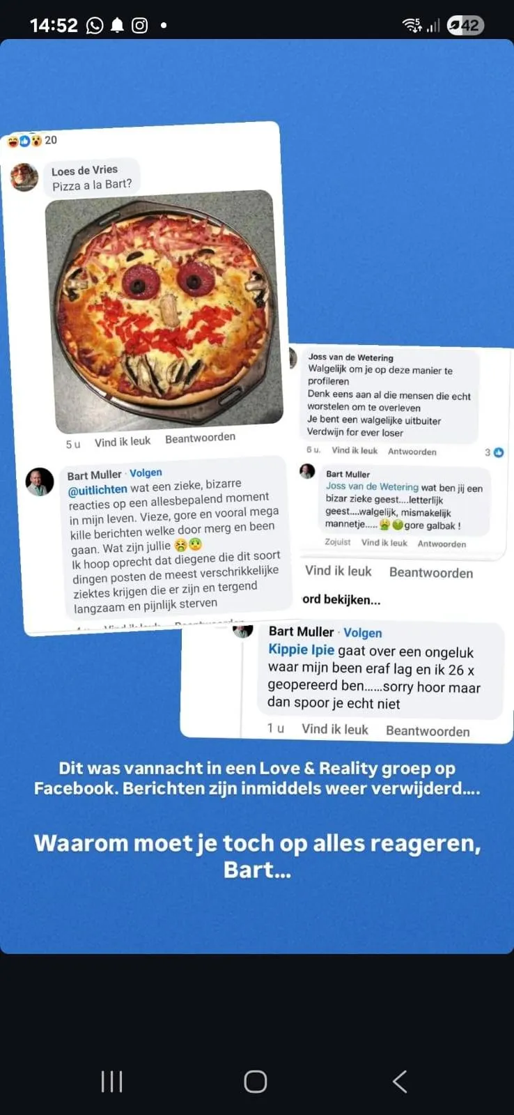 Bart beschreef zijn woede onomwonden: “Wat een zieke, bizarre reacties op een belangrijk moment in mijn leven,” deelde hij. “Vaak vieze, gore en kille boodschappen die door merg en been gaan. Mijn wens is dat de mensen achter deze berichten de ergste ziektes krijgen en tergend langzaam sterven.”