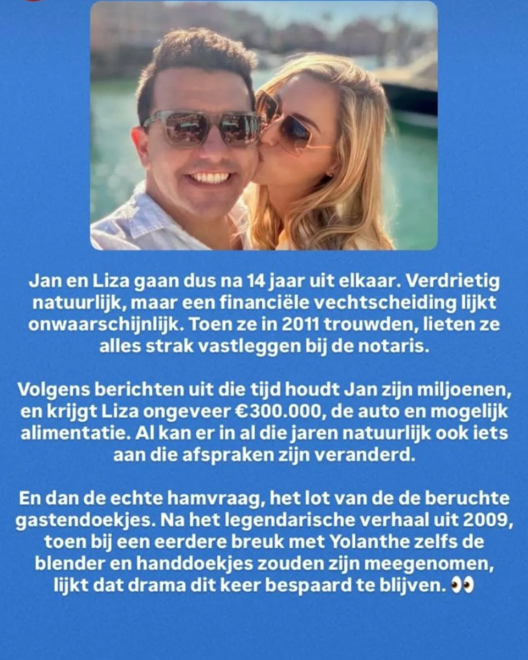 Bij het huwelijk lieten Jan en Liza hun voorwaarden door een notaris vastleggen, iets wat in showbizzkringen vaker voorkomt om onduidelijkheden later te voorkomen. In dat convenant zijn afspraken gemaakt over vermogensdeling, bepaalde eigendommen en ook over een vergoeding voor het geval de relatie zou eindigen.