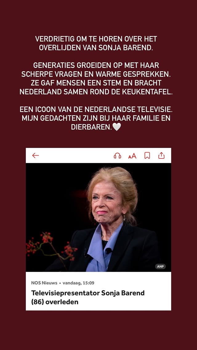 Wat nooit ter discussie stond, is de rol van Sonja Barend in de Nederlandse cultuur. Haar interviews en programma’s lieten diepe sporen na: ze bracht onderwerpen op tafel, voerde scherpe dialogen en wist miljoenen kijkers te raken. Voor velen vervult haar overlijden een echt verdrietig hoofdstuk in de media-geschiedenis.